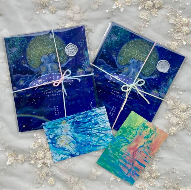 【贈りもの2冊セット】 女神のマインドフルネス 2冊 ポストカードを2枚(ランダム)お入れします。 PP袋にシールなどの簡易ラッピング付き。 ※ポストカードの絵柄は、お任せください。 ※ラッピングのシールやリボンなどの仕様は見本と変わる場合がございます。 ご自分用と、 もう一冊は大切な方へ。 日々を整える時間を、 分かち合っていただける2冊セットです。 ________________ 売り切れていた画集『女神のマインドフルネス』が、 装いを新たに再入荷いたしました。 今回の増刷分は、 ・表紙に金箔をあしらった仕様 ・ページのはじまりと終わりに、トレーシングペーパーの遊び紙入り より洗練され、作品の世界観を感じていただける仕上がりです。 青山京古の絵と、 青山雅明による言葉。 日々の中で、心を整えるための一冊。 深呼吸したくなる夜に。 ご自身のためにも、 大切な方への贈りものにも。 ・40ページ ・サイズ:天地22cm × 左右18.5cm ・オフセット印刷/フルカラー ・金箔押し表紙 ・トレーシングペーパー遊び紙入り ・送料込み価格 カバー&扉デザイン/mori ornament